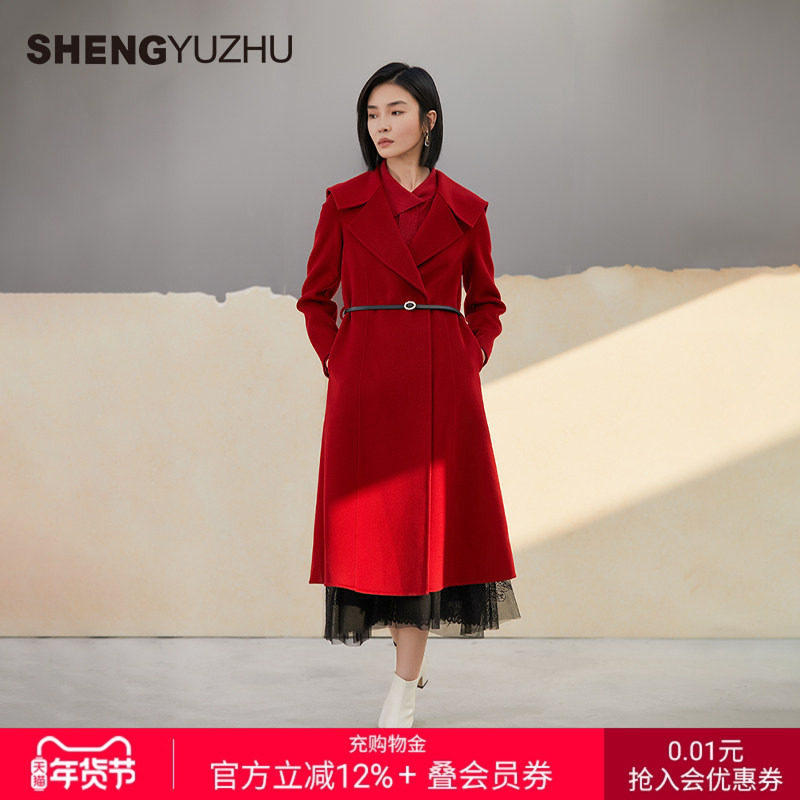 声雨竹2025秋季新长款系带大衣气质通勤绵羊毛山羊绒面料毛呢大衣