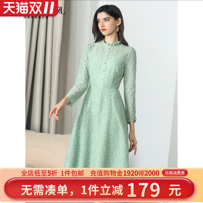 未风绿色蕾丝连衣裙女秋2025年秋季新款女装气质高腰减龄长袖裙子