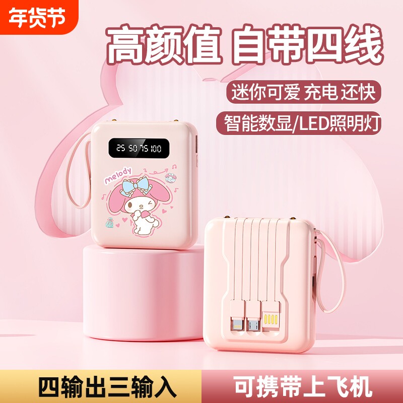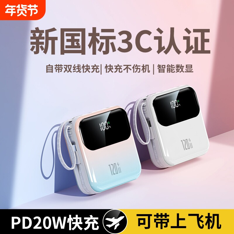 3C认证新款大容量充电宝20000毫安快充自带线超薄小巧便携迷你移动电源可爱适用苹果华为vivo专用可带上飞机