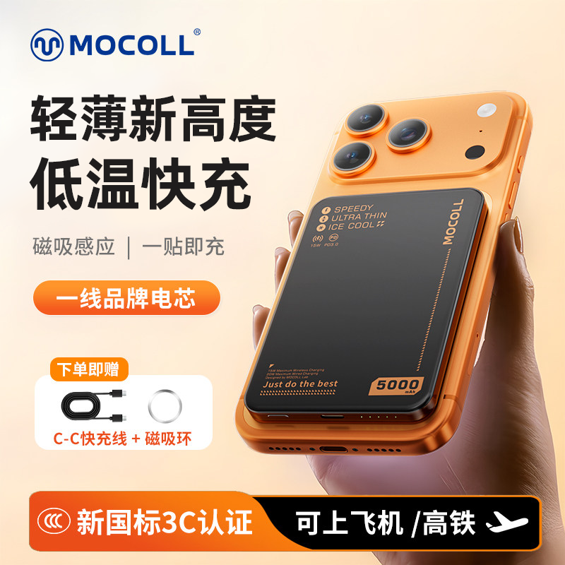 【3C认证/新年礼品】摩可超薄磁吸15w无线快充支架充电宝5000毫安大容量便携迷你移动电源适用华为苹果小米