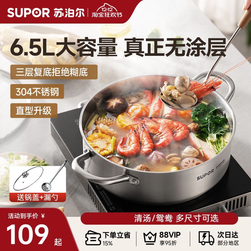 苏泊尔304不锈钢汤锅加厚复合多层底燃气电磁炉通用贴心防烫家用