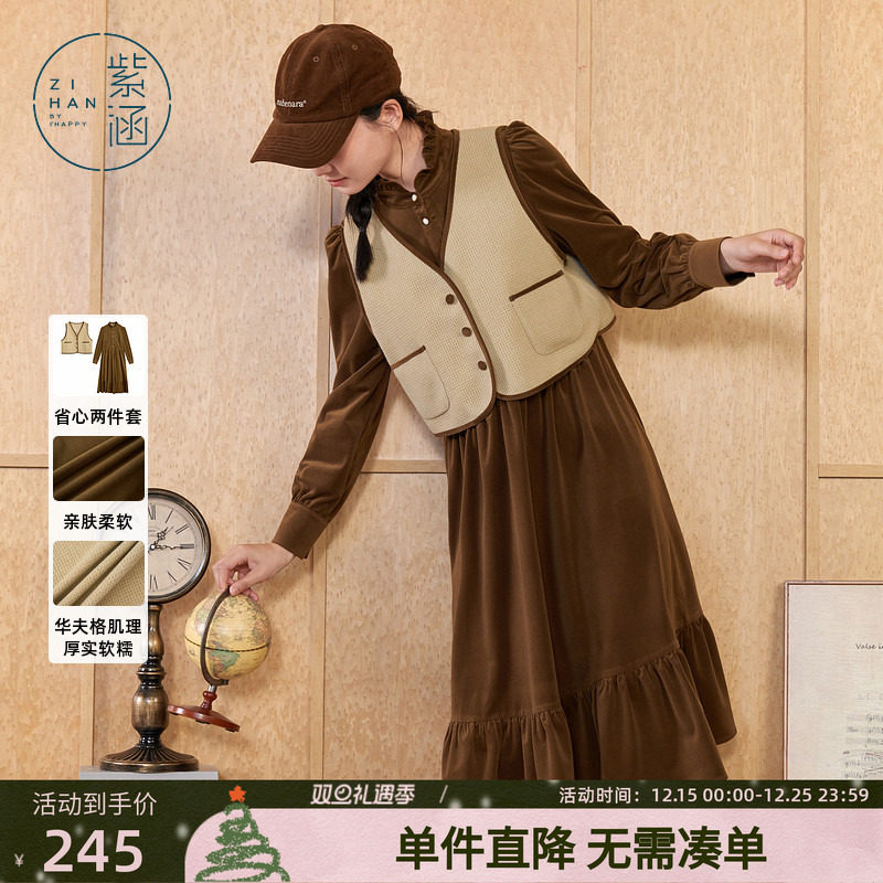 紫涵复古美拉德绒感中长款连衣裙马甲背心外套两件套装女冬季新款
