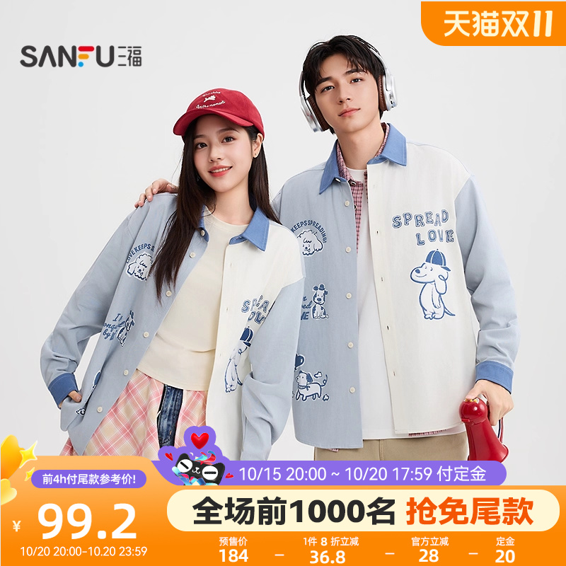 三福2025秋冬新款衬衫男长袖撞色趣味图案印花休闲翻领宽松衬衣