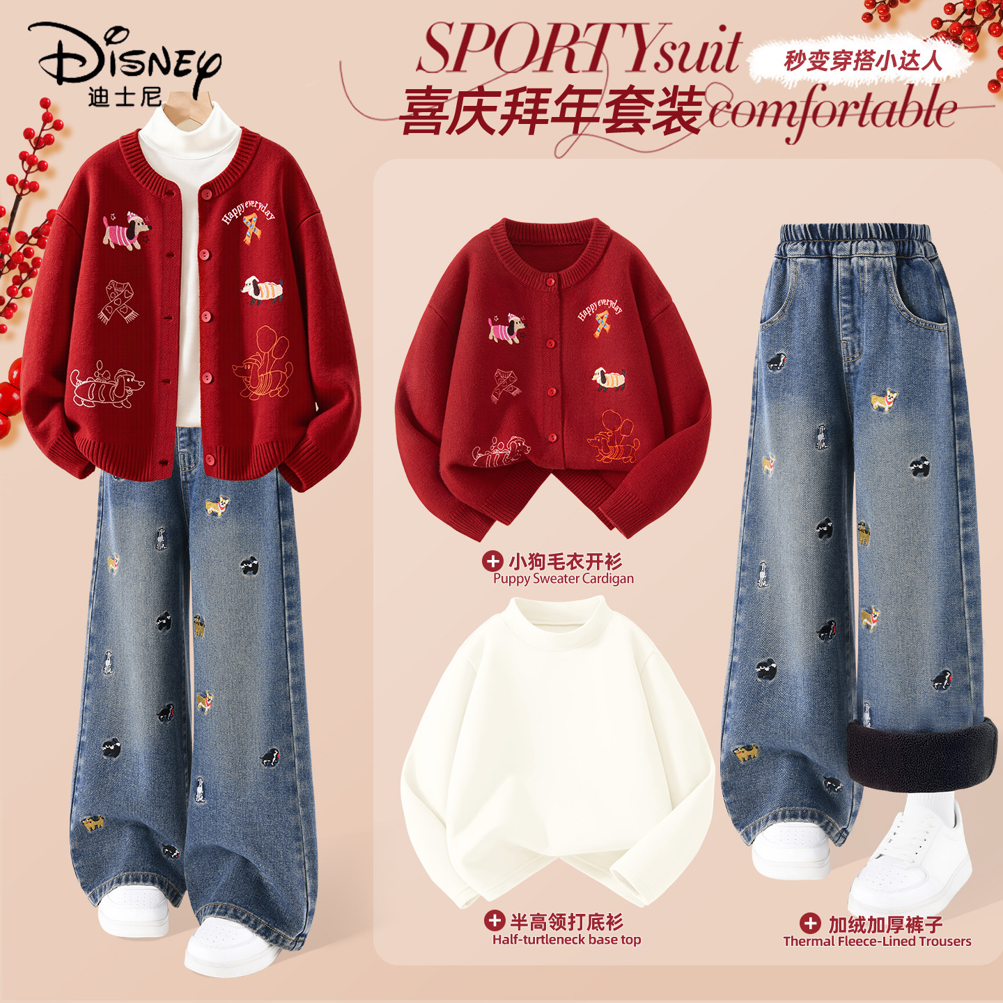迪士尼女童冬装套装冬季2026新款红色拜年服三件套儿童马年过年服