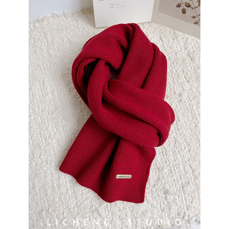 新年礼物酒红色围巾女秋冬韩版百搭学生加厚保暖纯色毛线针织围脖
