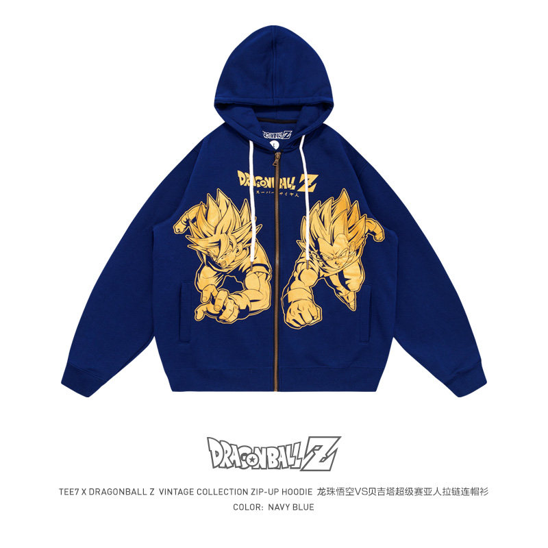 TEE7-日系动漫龙珠悟空贝吉塔烫金复古宽松纯棉连帽卫衣拉链开衫