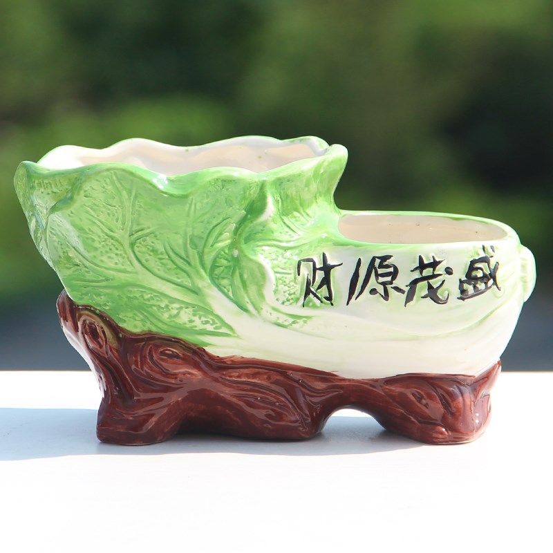 双口连体陶瓷花盆室内发财树盆栽盆景个性复古大白菜造型多孔花盆