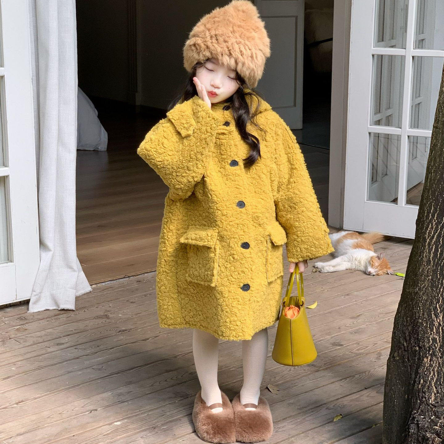 2025新款可爱休闲羊羔毛白色中长款女童夹棉韩版儿童上衣毛毛外套