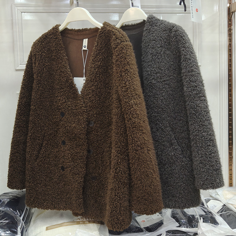 V领双排扣绵羊羔毛外套女皮毛一体颗粒绒毛毛皮草韩版中长款上衣