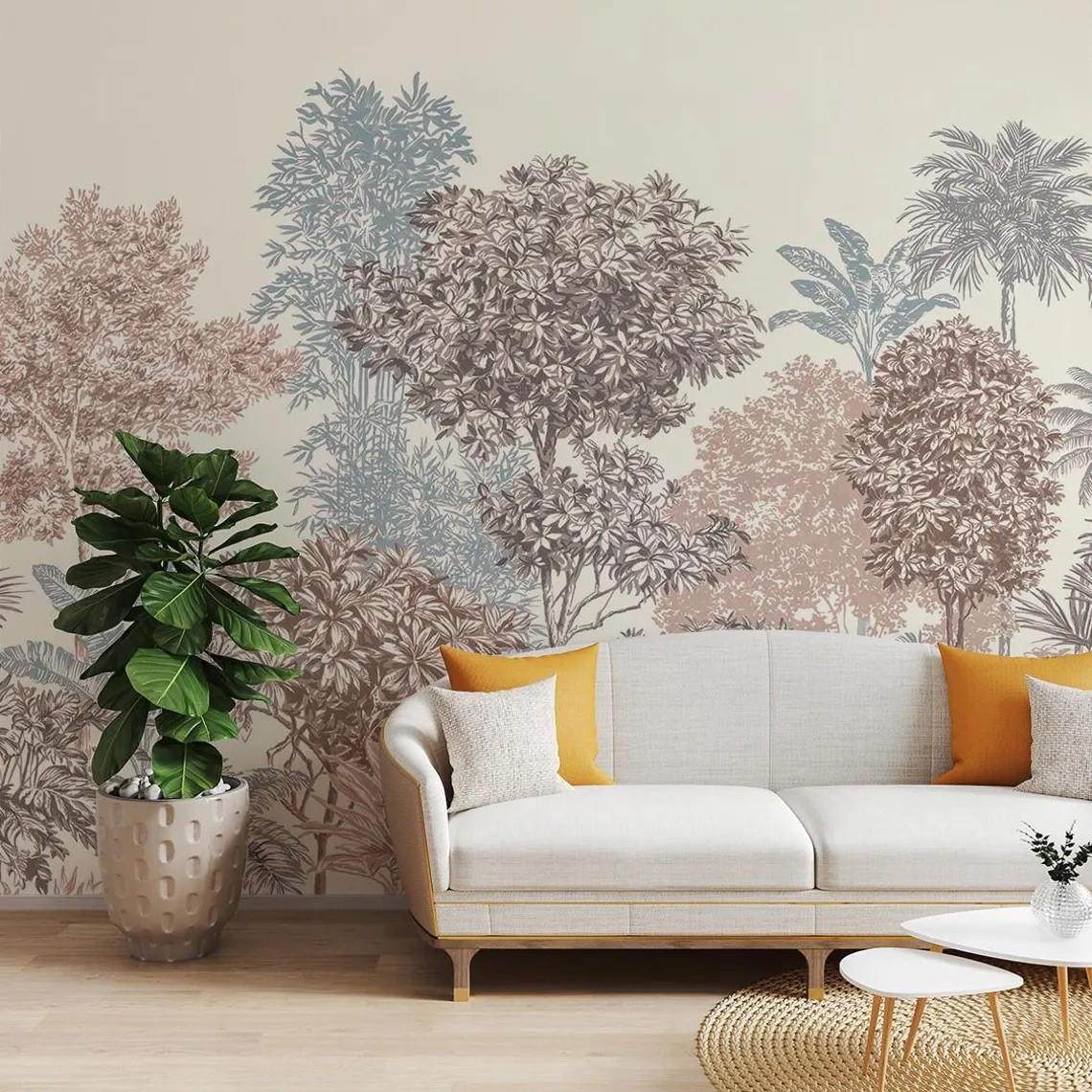 手绘热带丛林轻奢复古色调植物森林壁纸卧室餐厅酒店背景墙布壁纸