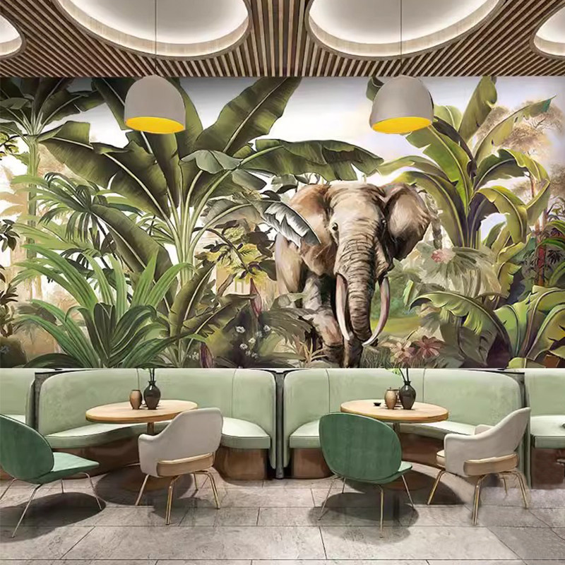 东南亚餐厅泰式风格墙纸热带雨林植物壁画芭蕉叶装饰泰国森林壁纸