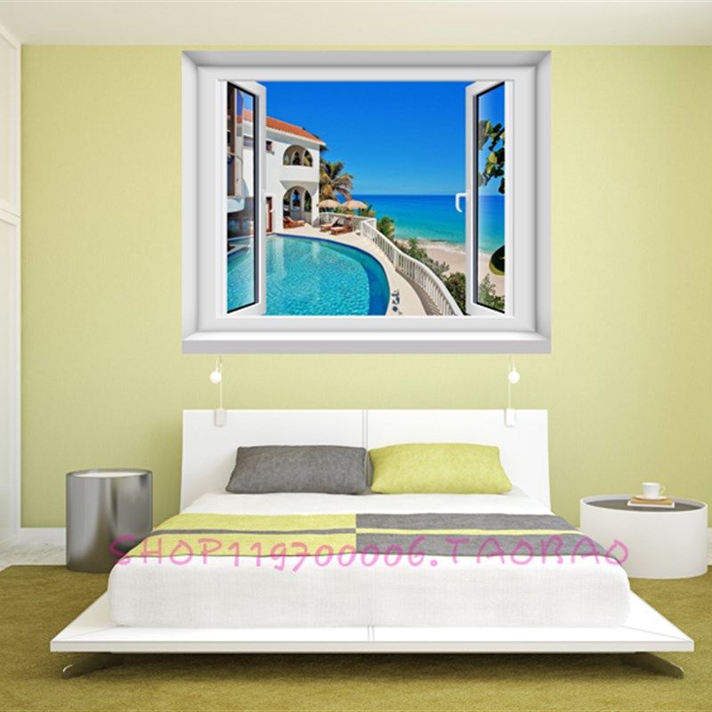 3D卧室假窗户墙贴画唯美风景海景餐厅墙面装饰森林壁纸客厅墙纸