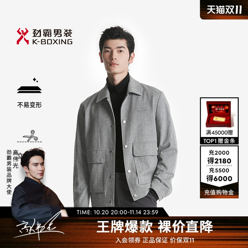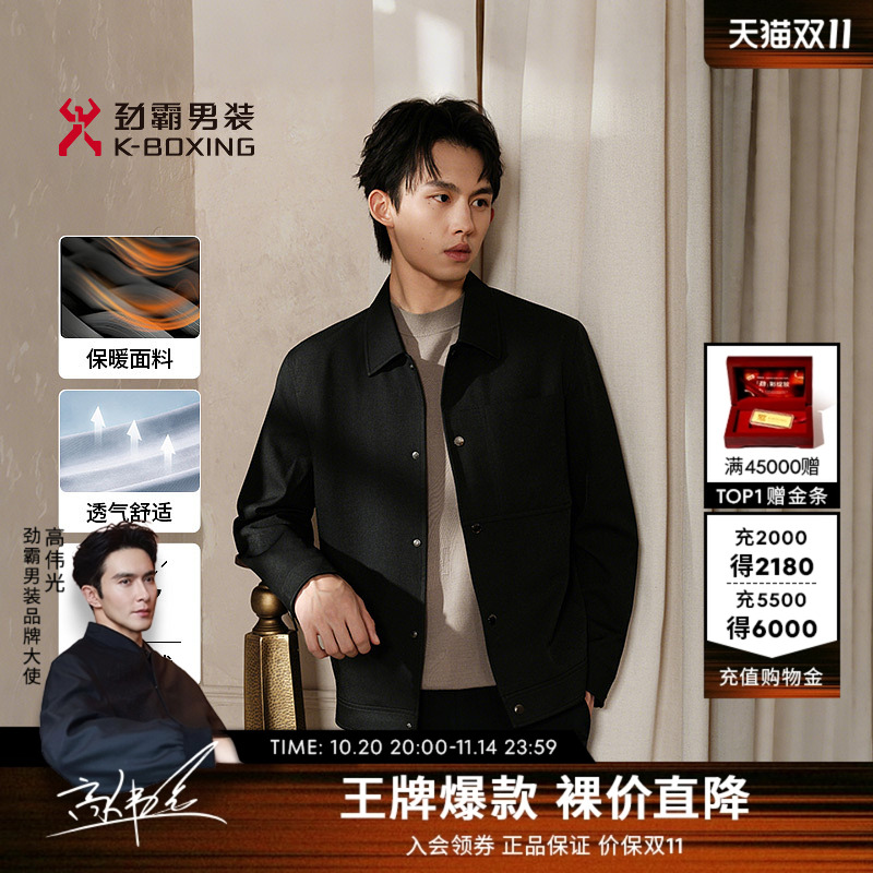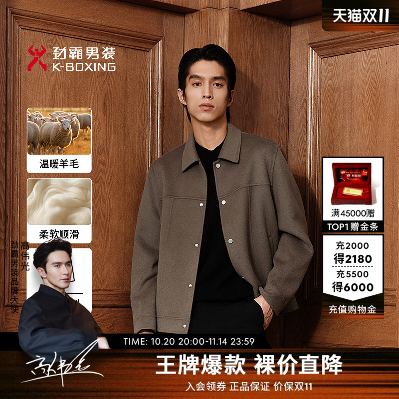 【100%羊毛】劲霸男装男士外套秋冬时尚经典翻领保暖短款毛呢夹克