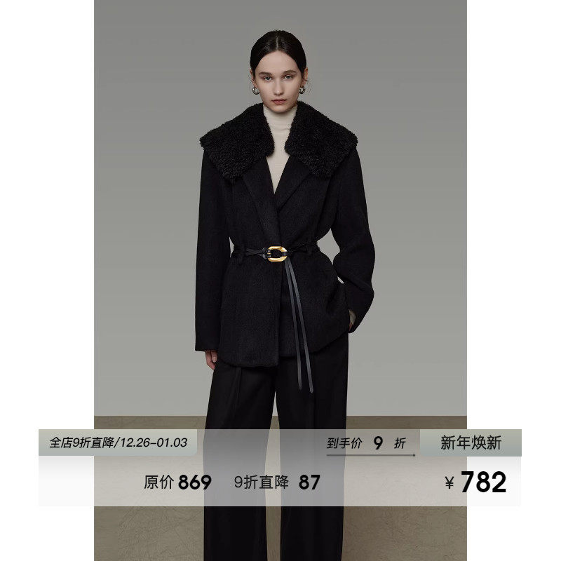 Basic House/百家好韩系大翻领双面呢大衣气质感短款系带毛呢外套