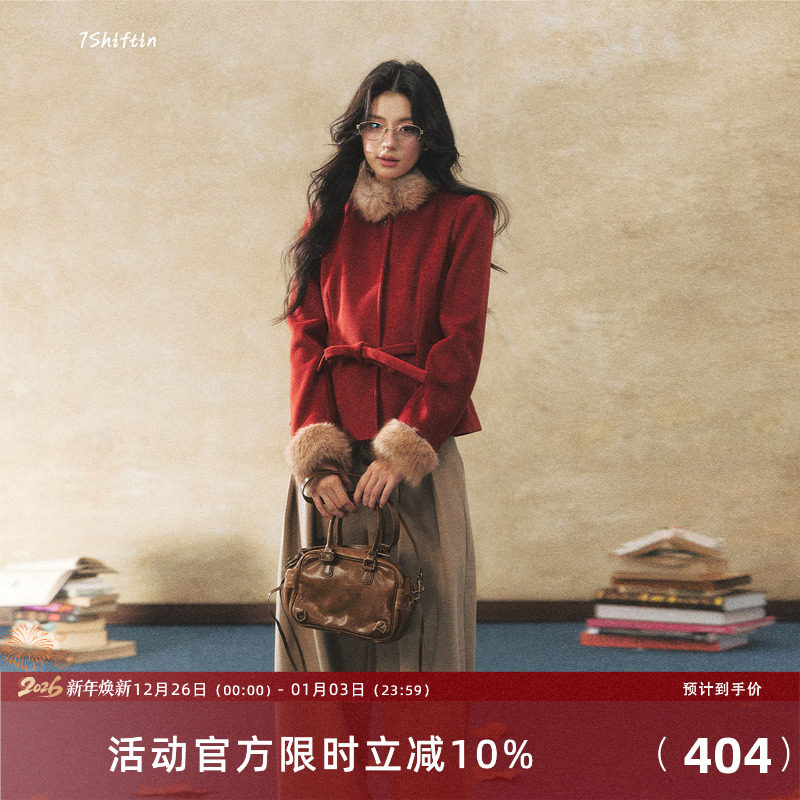7Shiftin 原创设计双色系带毛领拼毛呢外套冬季收腰显瘦气质上衣