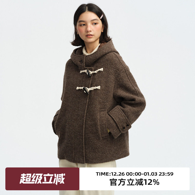 omont蛋挞家复古牛角扣连帽系带毛呢外套2025冬季慵懒宽松短大衣
