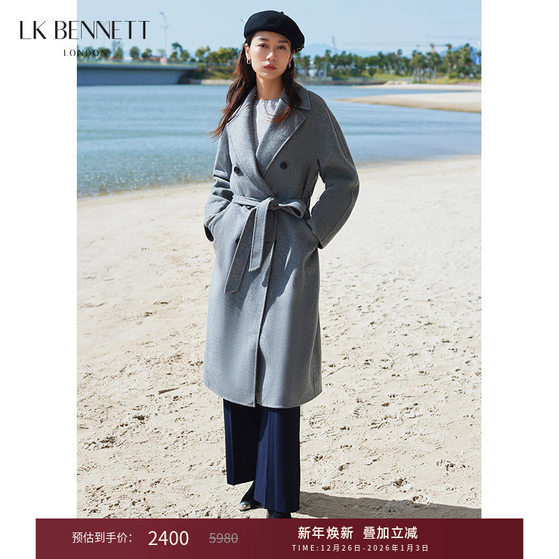lkbennett灰色绵羊毛大衣女冬季气质高级双排扣收腰系带毛呢外套