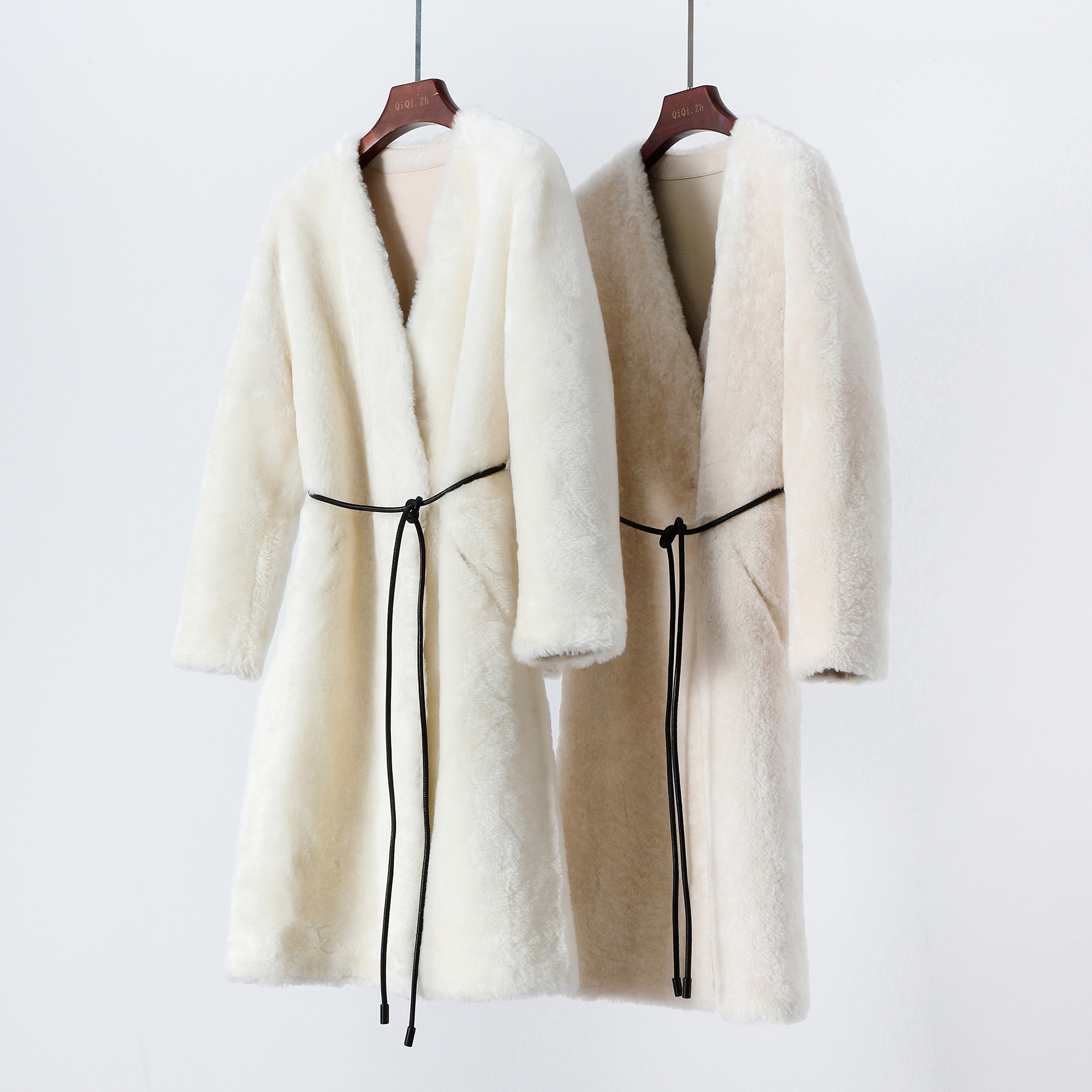 皮毛一体 中长款V领收腰系带毛呢外套米白色保暖皮草 真皮大衣