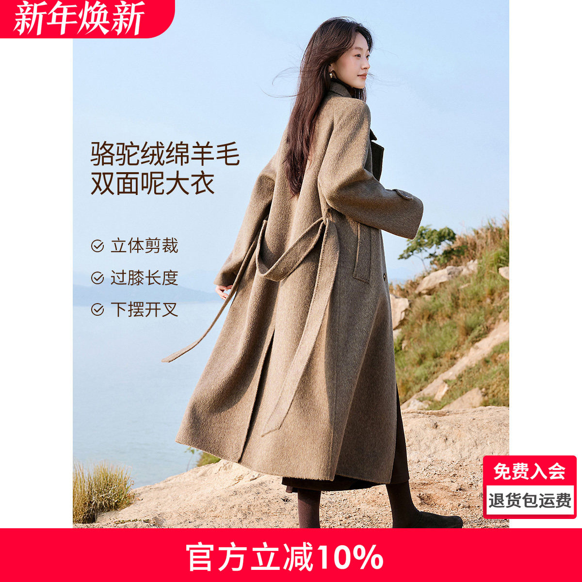沫晗依美含骆驼绒休闲手工羊毛双面呢大衣25冬季长款系带毛呢外套