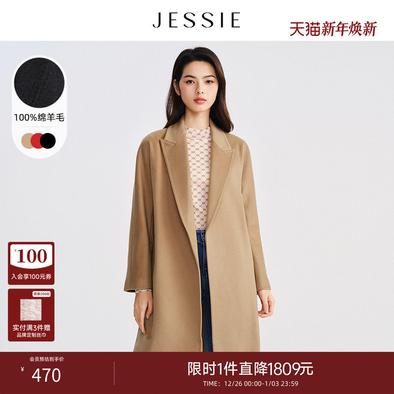 【商场同款】JESSIE时尚西装领100%绵羊毛系带毛呢外套女冬款