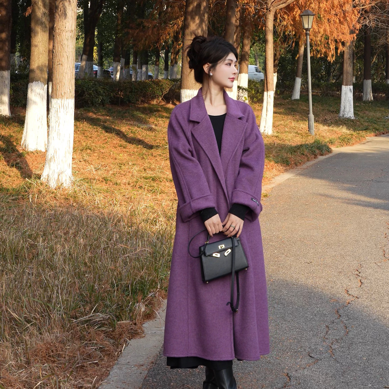 紫色双面绒呢大衣2024年秋冬新款韩版宽松中长款系带毛呢外套女