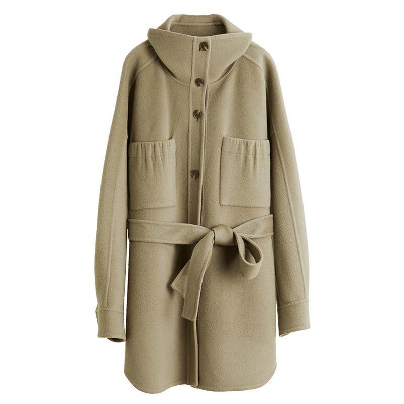 25131-38小个子中长款真袖毛双面羊毛大衣女连帽浴袍系带毛呢外套