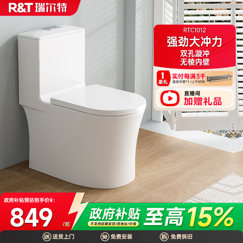 瑞尔特普通家用马桶静音无棱内壁虹吸卫生间大U节水一体式坐便器