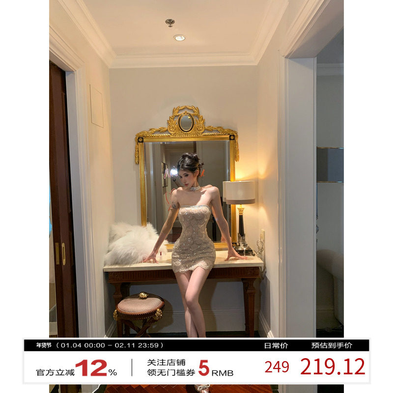 牛了牛了 名媛吊带连衣裙女2025冬季新款轻奢亮片包臀裙性感裙子