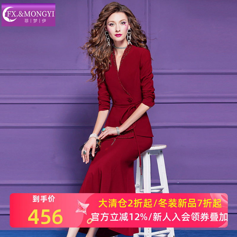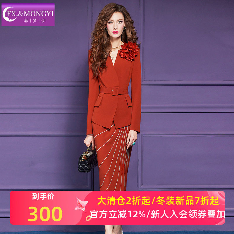 菲梦伊钉珠红色职业套装女秋季轻熟气质荷叶边西装上衣鱼尾半身裙