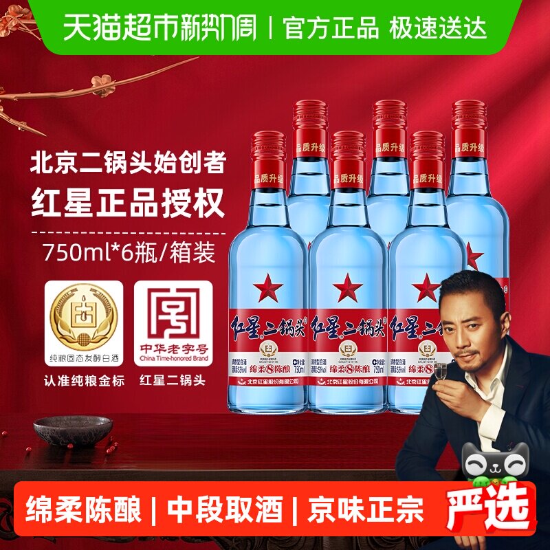 红星二锅头蓝瓶绵柔8纯粮53度750ml*6瓶整箱清香型白酒纯粮口粮酒