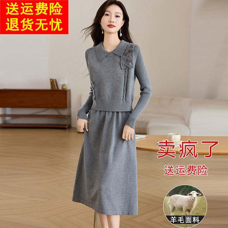 时尚两件套羊绒连衣裙女中长款秋冬2024新款高级感羊毛打底毛衣裙
