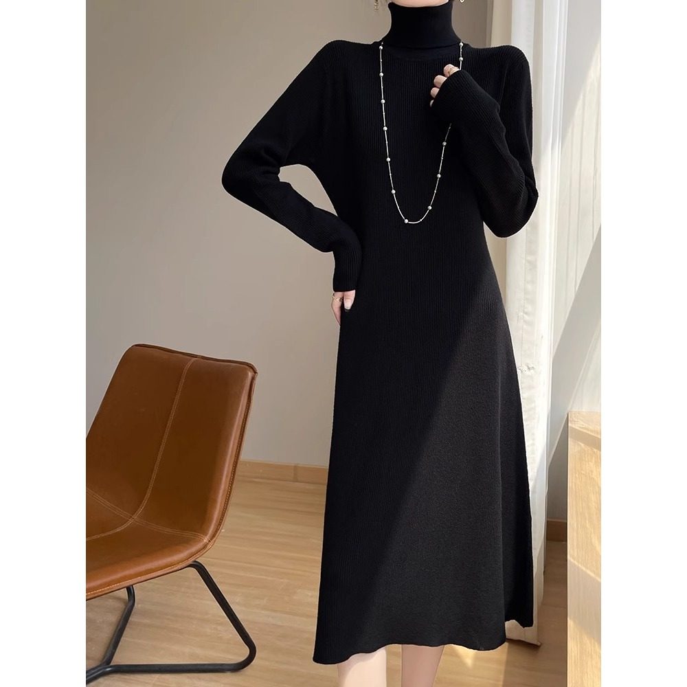 长款针织连衣裙女秋季新款过膝高腰堆堆领加厚打底衫毛衣裙配大衣