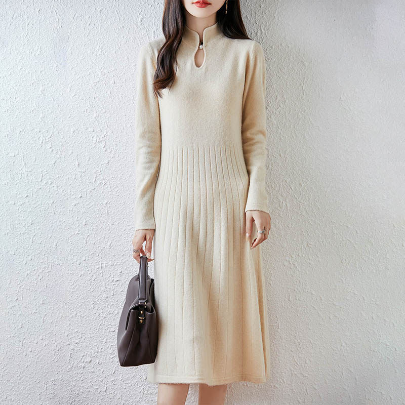 新中式国风100%纯羊毛衫连衣裙女立领针织毛衣中长款过膝羊绒长裙