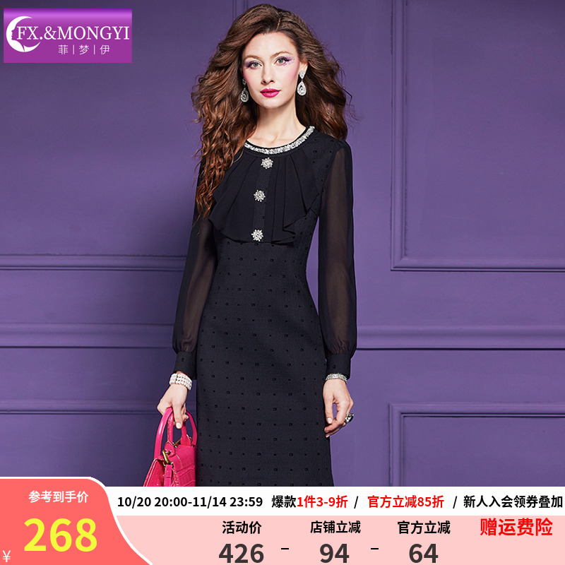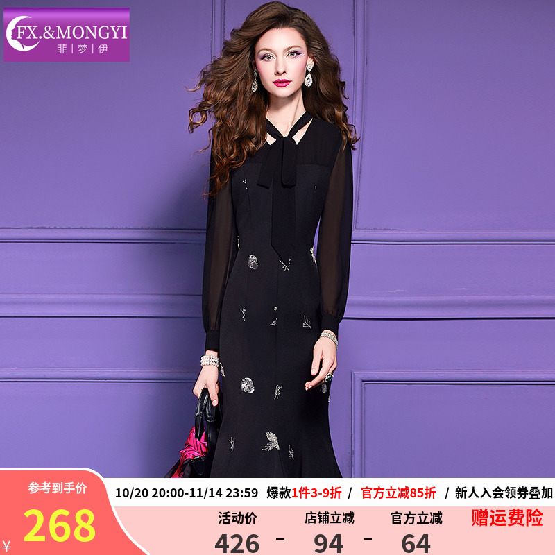 菲梦伊原创钉珠黑色衬衫连衣裙女长袖秋装富家千金名媛气质鱼尾裙