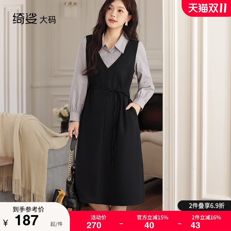 绮娑秋新装V领马夹长袖衬衫拼接假两件A字裙大码胖MM连衣裙中长款