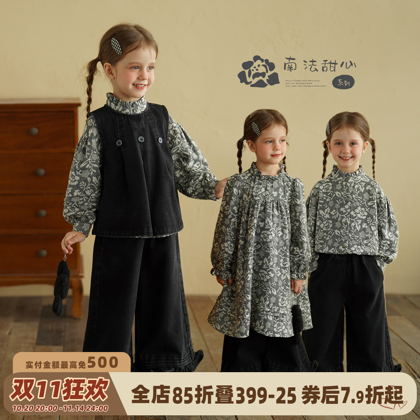 砚台家童装女童复古马甲套装秋季儿童长袖衬衫牛仔裤女宝宝连衣裙
