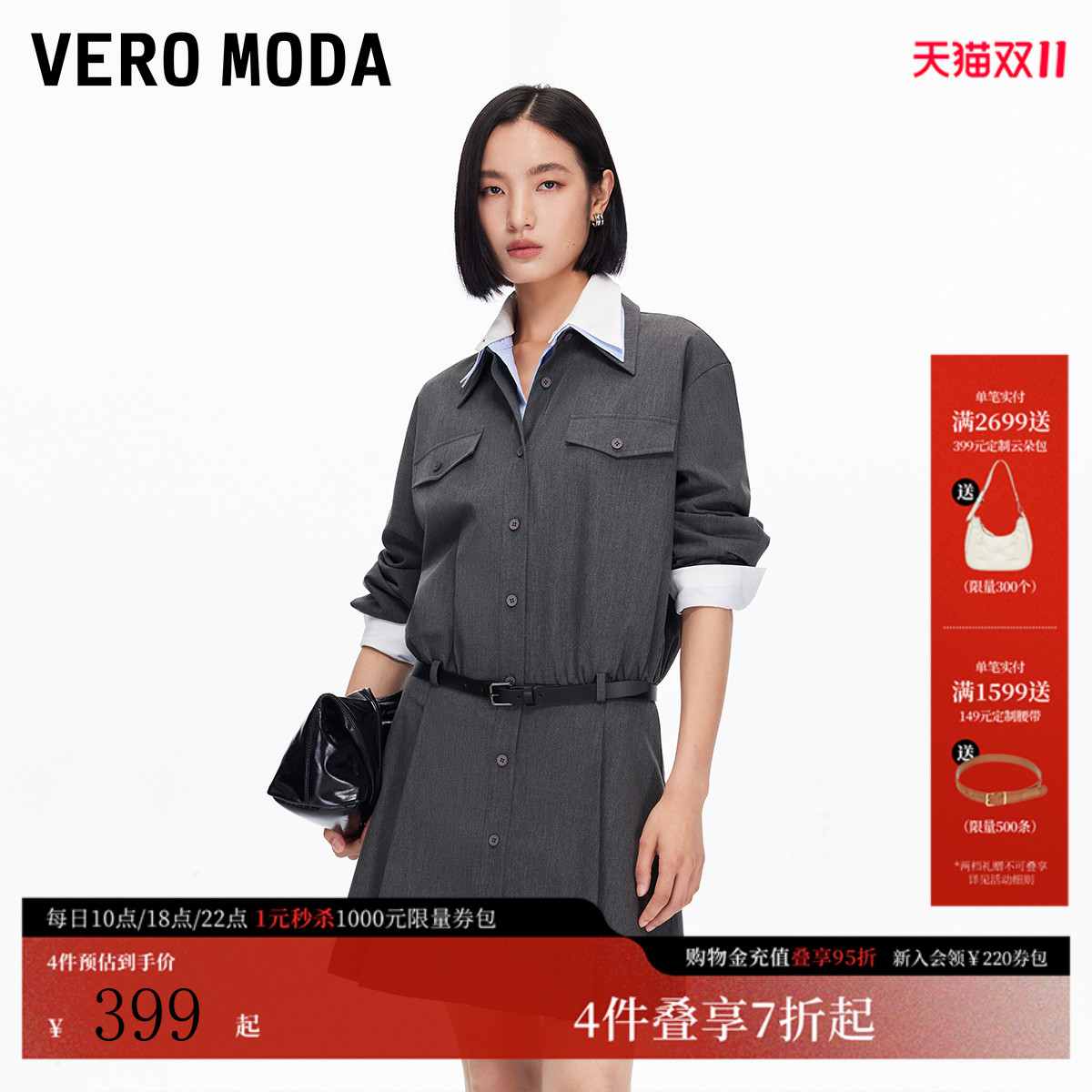 Vero Moda连衣裙2025秋季新款腰带装饰简约长袖衬衫裙通勤百搭