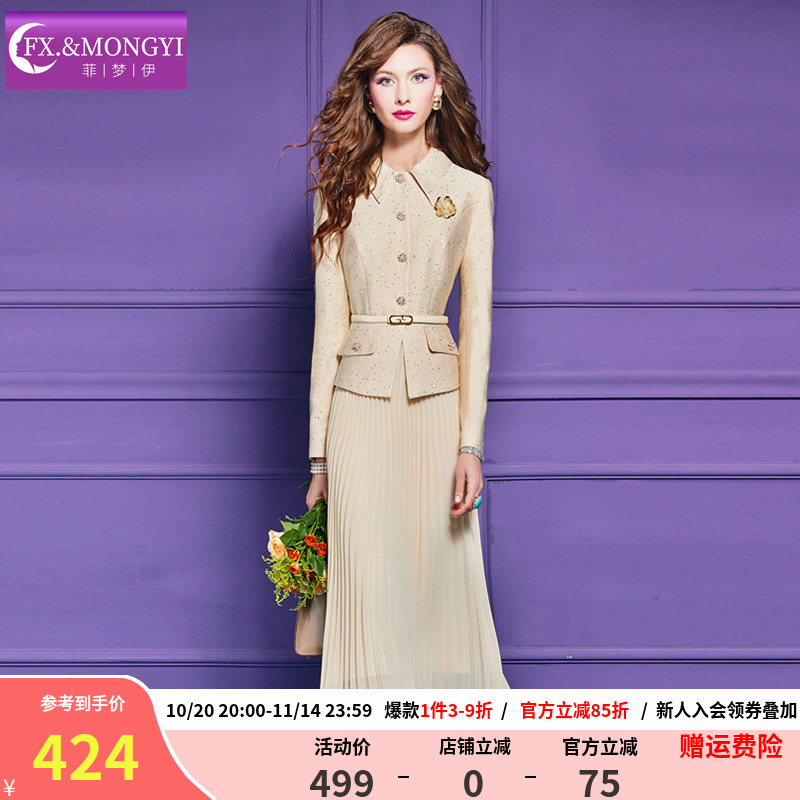 菲梦伊钉珠毛呢衬衫连衣裙女长袖秋装名媛高端收腰假两件百褶裙子
