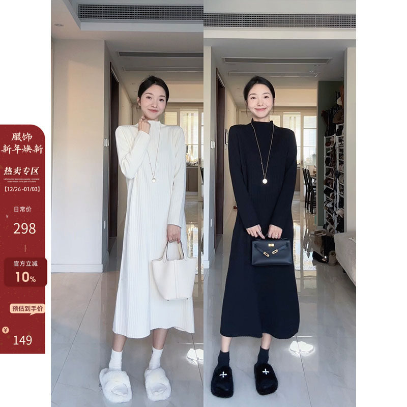【郭九九呢】直筒宽松半高领毛衣针织连衣裙女秋冬新款打底长裙子