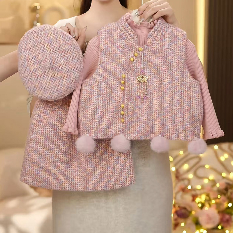 女童套装冬季2025新款韩版时髦保暖马甲毛衣加绒阔腿裤三件套