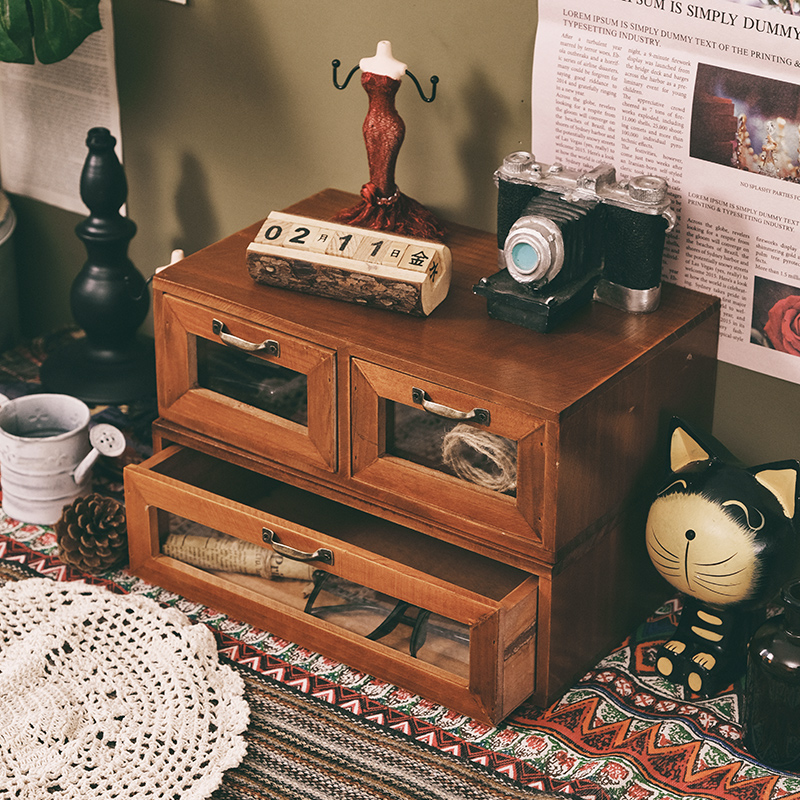 桌面收纳盒盲盒收纳木质玻璃抽屉式复古实木zakka化妆品柜子多层