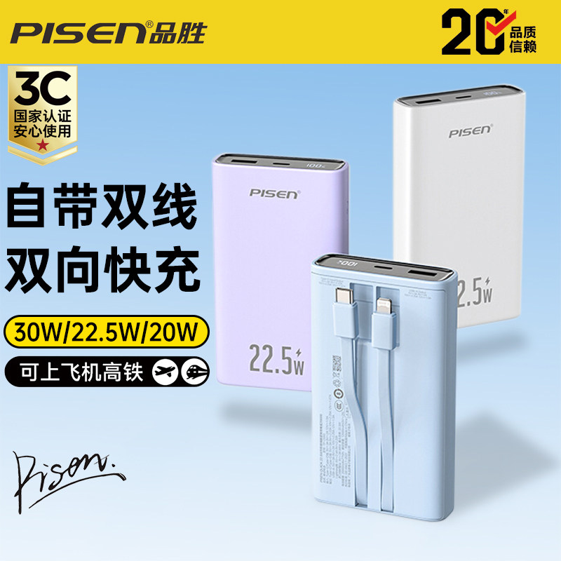 国家3C认证2026新款品胜充电宝自带双线20000毫安大容量可上飞机高铁22.5W/30W快充移动电源适用苹果小米华为