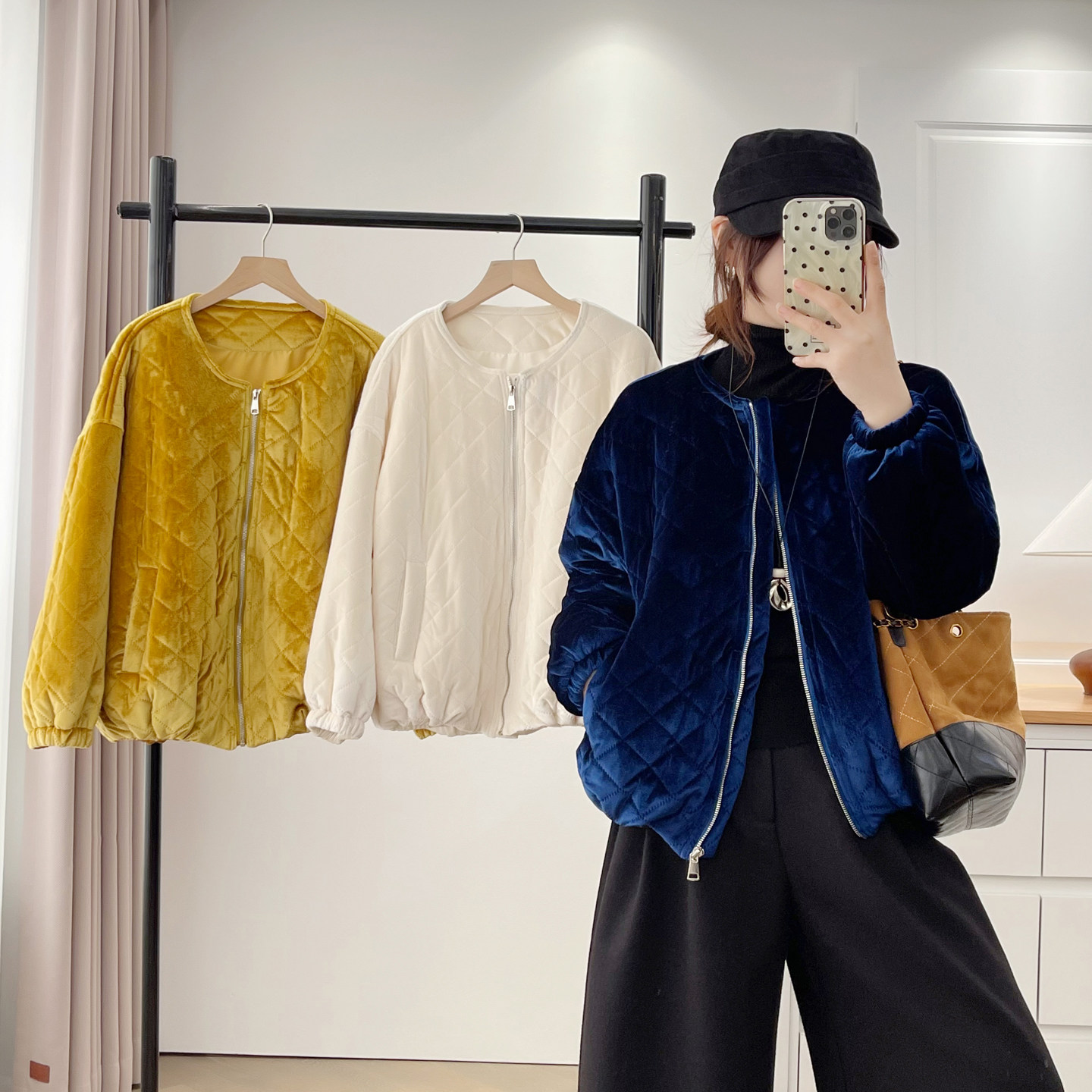棉衣女宽松大码2025秋冬新款胖妹妹时尚圆领丝绒菱格拉链棉服外套