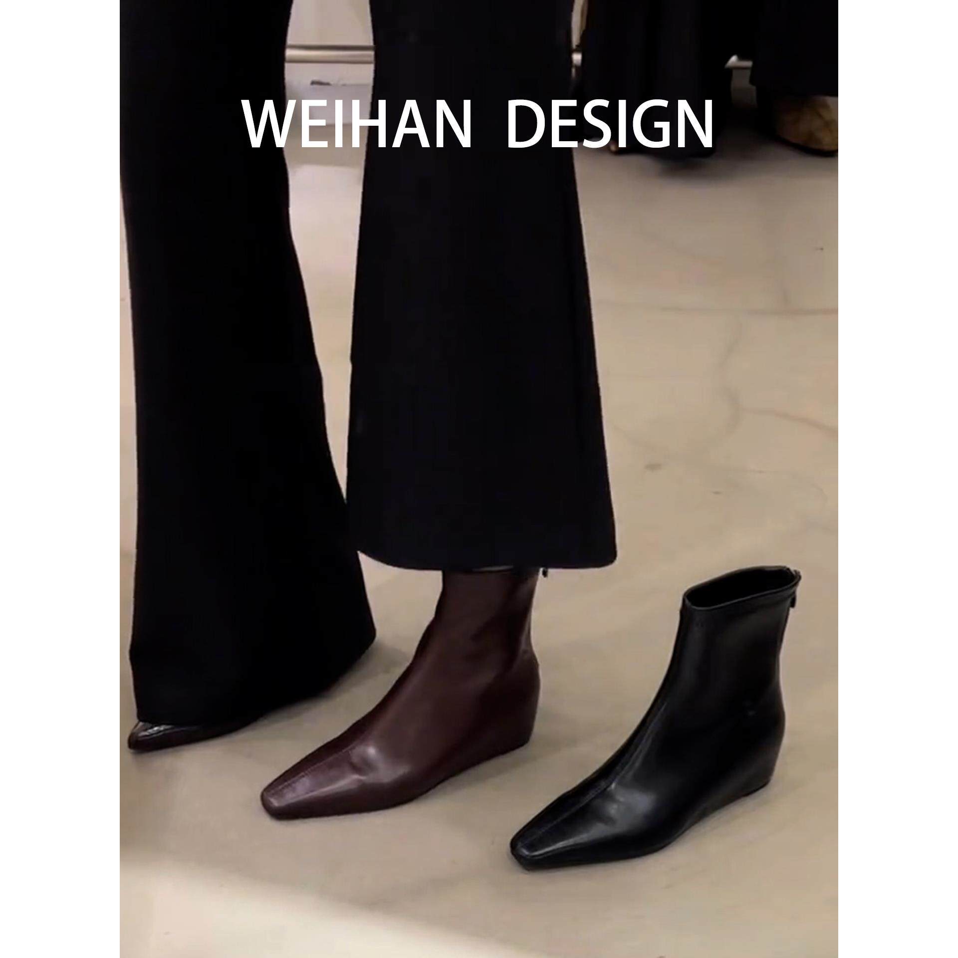 羊皮版!法式小方头坡跟短靴女百搭软皮时装靴不累脚内增高瘦瘦靴