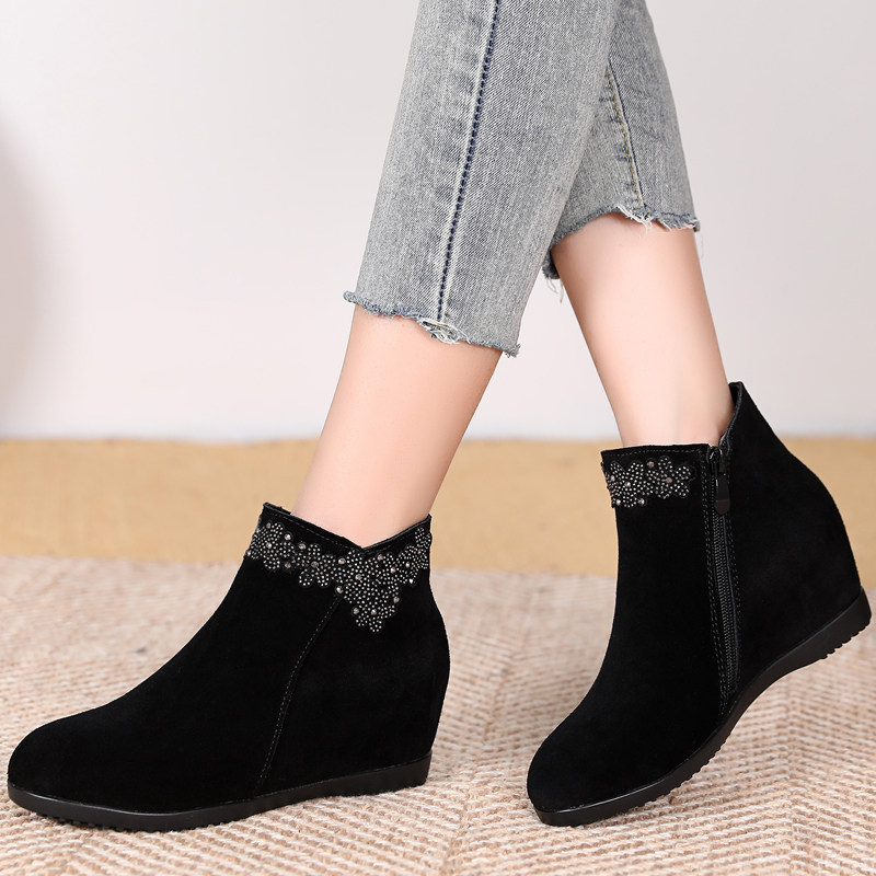 2025新款秋冬季平底磨砂真皮内增高小短靴坡跟女鞋加绒大码女靴子