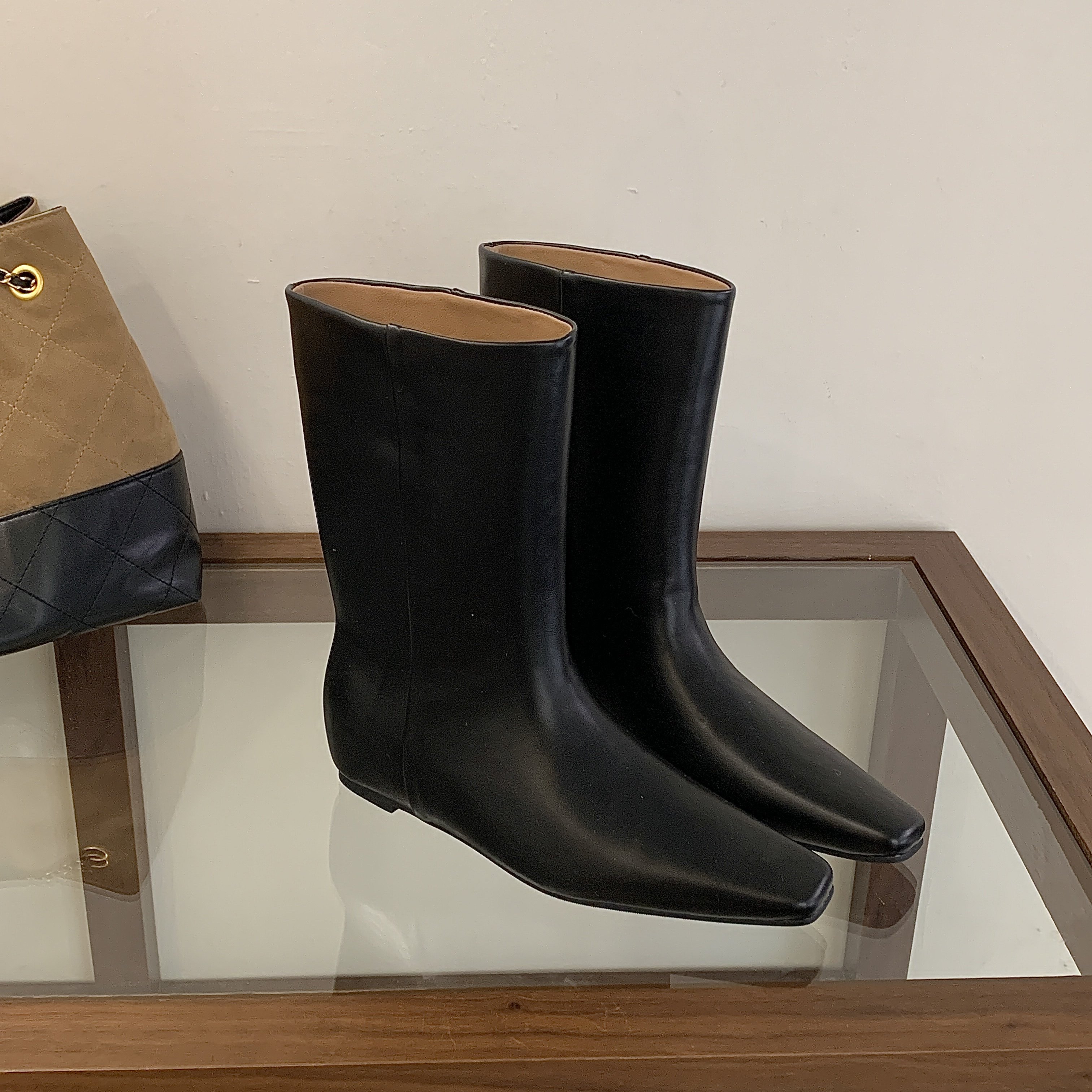 牛皮宽筒中筒靴2025年新款简约真皮坡跟方头短靴百搭内增高马丁靴