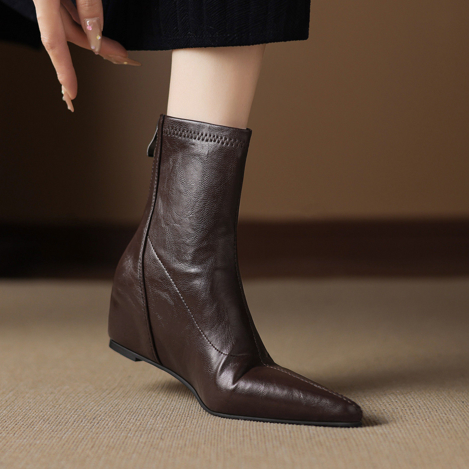 内增高瘦瘦靴女2025年秋冬新款通勤尖头软皮后拉链坡跟弹力靴短靴