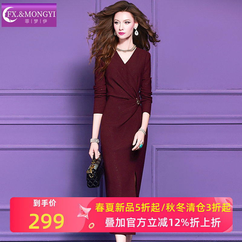 菲梦伊原创红色连衣裙女冬季设计感褶皱收腰V领开叉打底裙子礼服