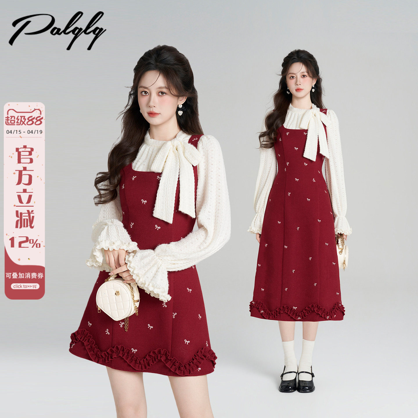 Palglg甜美风红色背心连衣裙女冬季新款高级感新年战袍千金套装裙