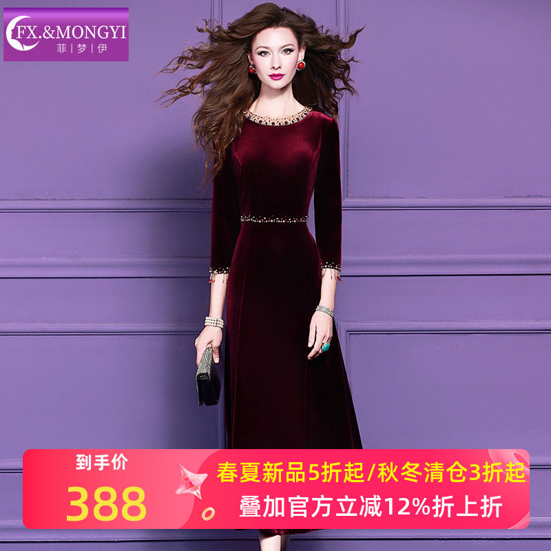 菲梦伊原创钉珠红色金丝绒连衣裙女冬季轻熟女人味收腰打底长裙子